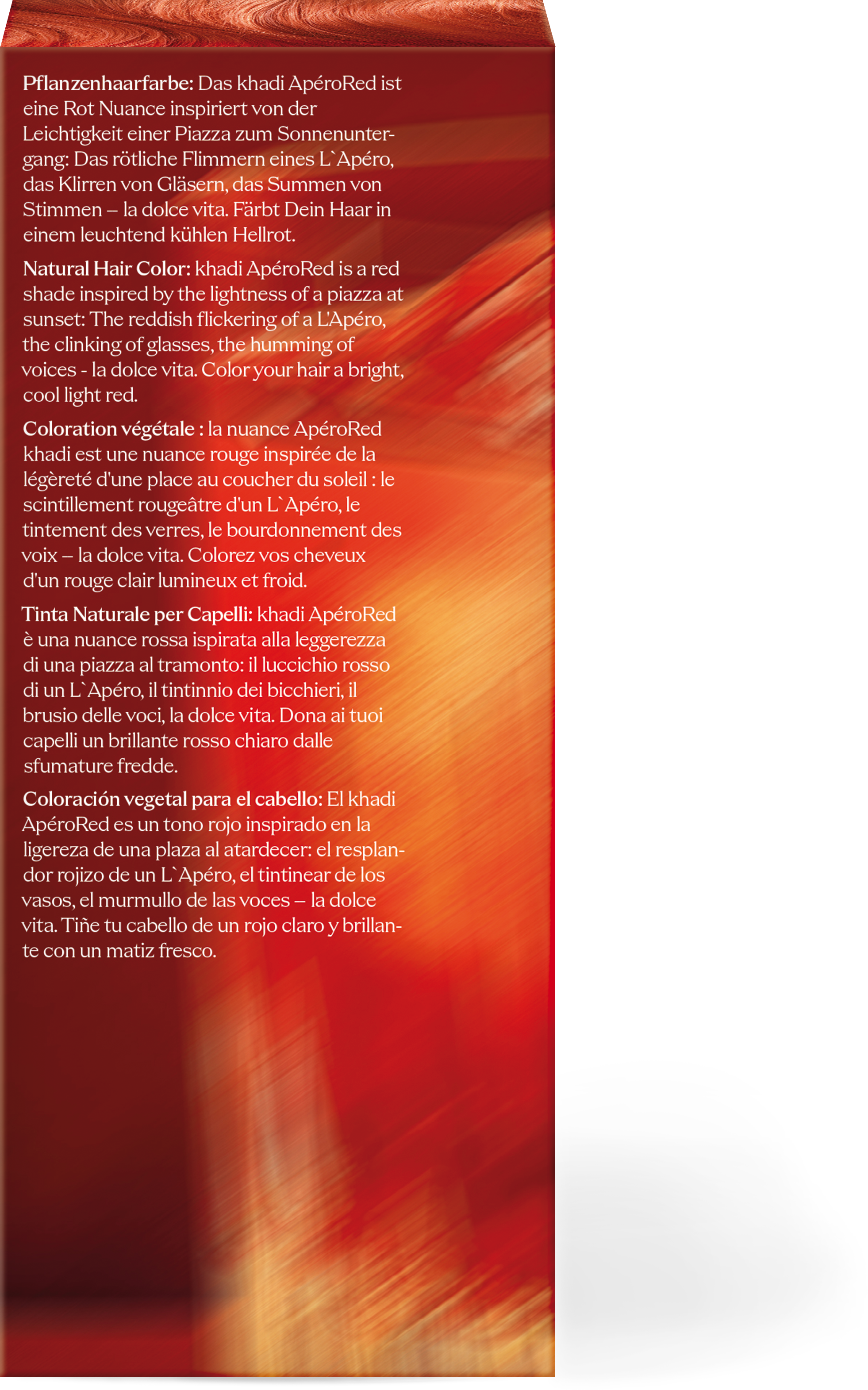 ApéroRed ist wie das rotgoldene Glitzern eines Apéro bei Sonnenuntergang. Es erinnert an das Klirren von Gläsern, fröhliches Stimmengewirr und die Wärme der Sonne - es ist khadis Hommage an das italienische Dolce Vita und bietet ein faszinierendes Wechselspiel aus tiefen, sonnenverliebten Rottönen und eleganten, kühleren Hellrot-Nuancen. Je nach Ausgangshaarfarbe beginnt innerhalb von 48 Stunden die Verwandlung und ApéroRed entfaltet eine zauberhafte Tiefe. Die leuchtende Wärme weicht einem kühleren, eleganteren Rot, das sanft sowie raffiniert flimmert – als hätte sich der Abendhimmel von feurigem Orange in ein Mondschein-Karminrot verwandelt.