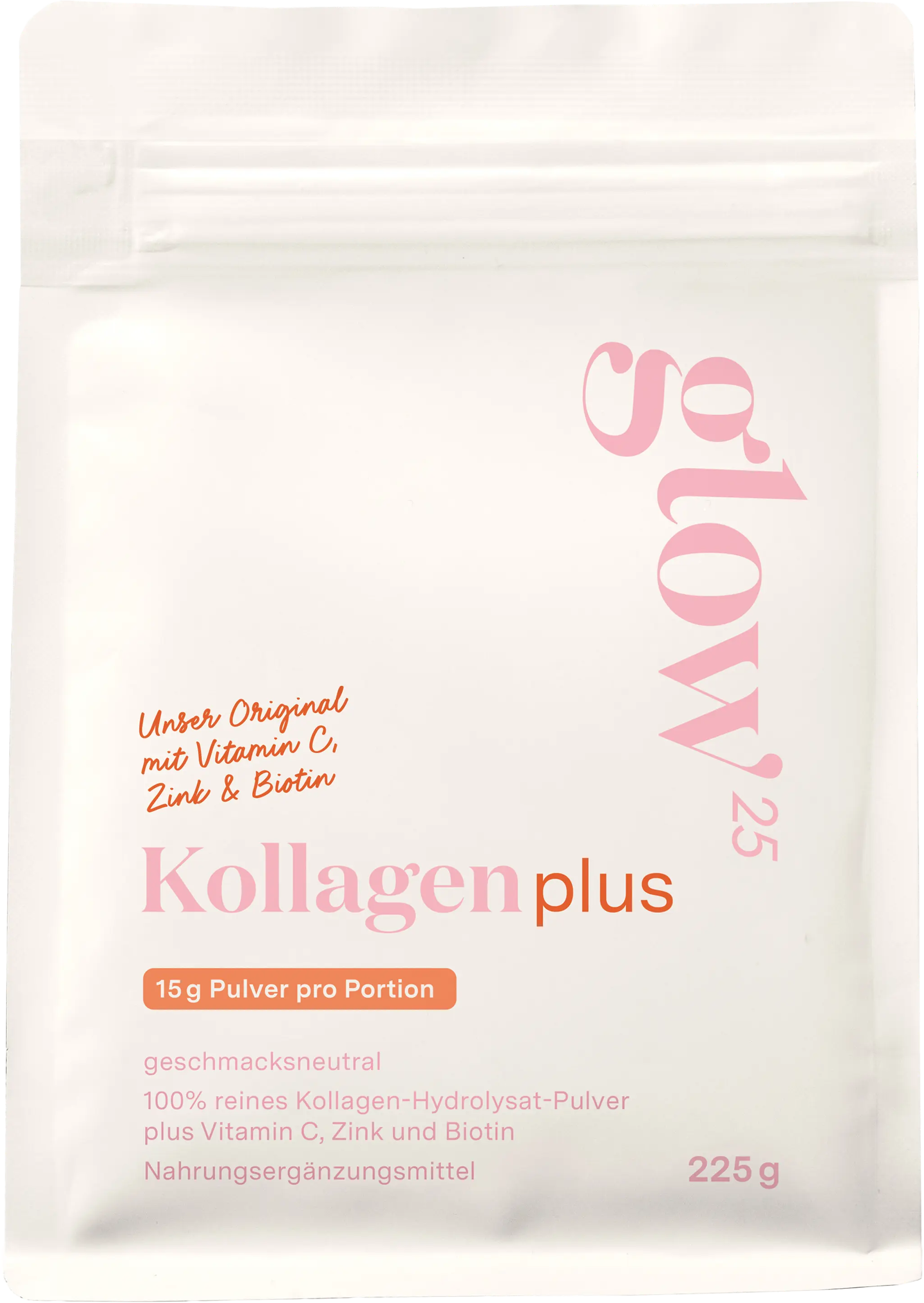 Glow25 Collagen Plus associe un hydrolysat de collagène de haute qualité à la vitamine C, au zinc et à la biotine. Sa poudre au goût neutre se mélange aisément à des boissons ou à des aliments, qu'ils soient froids ou chauds – idéale pour une utilisation quotidienne.