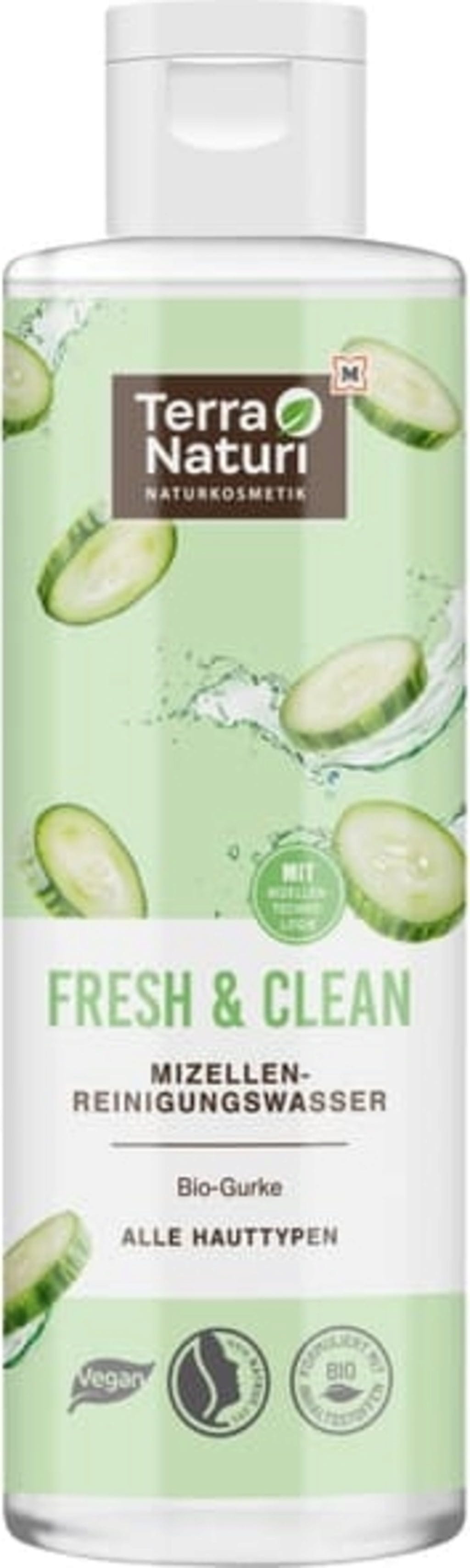 L'acqua micellare detergente della linea FRESH & CLEAN di Terra Naturi rimuove delicatamente trucco e impurità dal viso. L'estratto di cetriolo biologico e la betaina assicurano inoltre nutrimento e idratazione alla pelle.